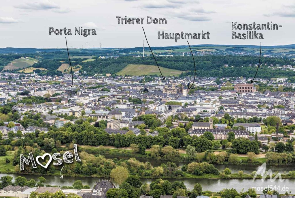 Bevor der Abstieg in die Stadt beginnt kann man aber noch weitere herrliche Panoramen über die Mosel auf die älteste Stadt Deutschlands bekommen. Dann geht es vorbei an roten Felsen und über die Kaiser-Wilhelm-Brücke Richtung Zentrum. Und natürlich geht es auf dem Weg zum Hauptbahnhof noch vorbei an der Porta Nigra, dem Wahrzeichen der Stadt. Vom Hauptbahnhof fährt dann der Zug zurück nach Konz.
